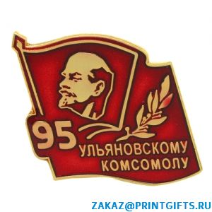 Металлические значки 90 лет Ульяновскому комсомолу. Покрытие золотом, красная прозрачная эмаль.