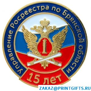 ![]() Юбилейные значки 15 лет Управления Росреестра, штамповка, цветные эмали, покрытие золотом 999 пробы.